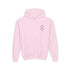 boy wearing white boys heavy blend hooded sweatshirt with kangaroo pocket and embroidery on chest