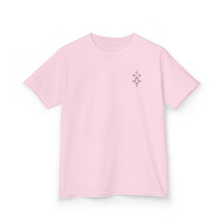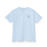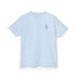 The kids heavy cotton tee is perfect for everyday use. The fabric is 100% cotton for solid colors. Polyester is included for heather-color variants. These fabrics are prime materials for printing. The shoulders have twill tape for improved durability. The collar is curl resistant due to ribbed knitting. There are no seams along the sides.