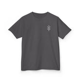 The kids heavy cotton tee is perfect for everyday use. The fabric is 100% cotton for solid colors. Polyester is included for heather-color variants. These fabrics are prime materials for printing. The shoulders have twill tape for improved durability. The collar is curl resistant due to ribbed knitting. There are no seams along the sides.